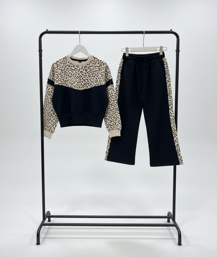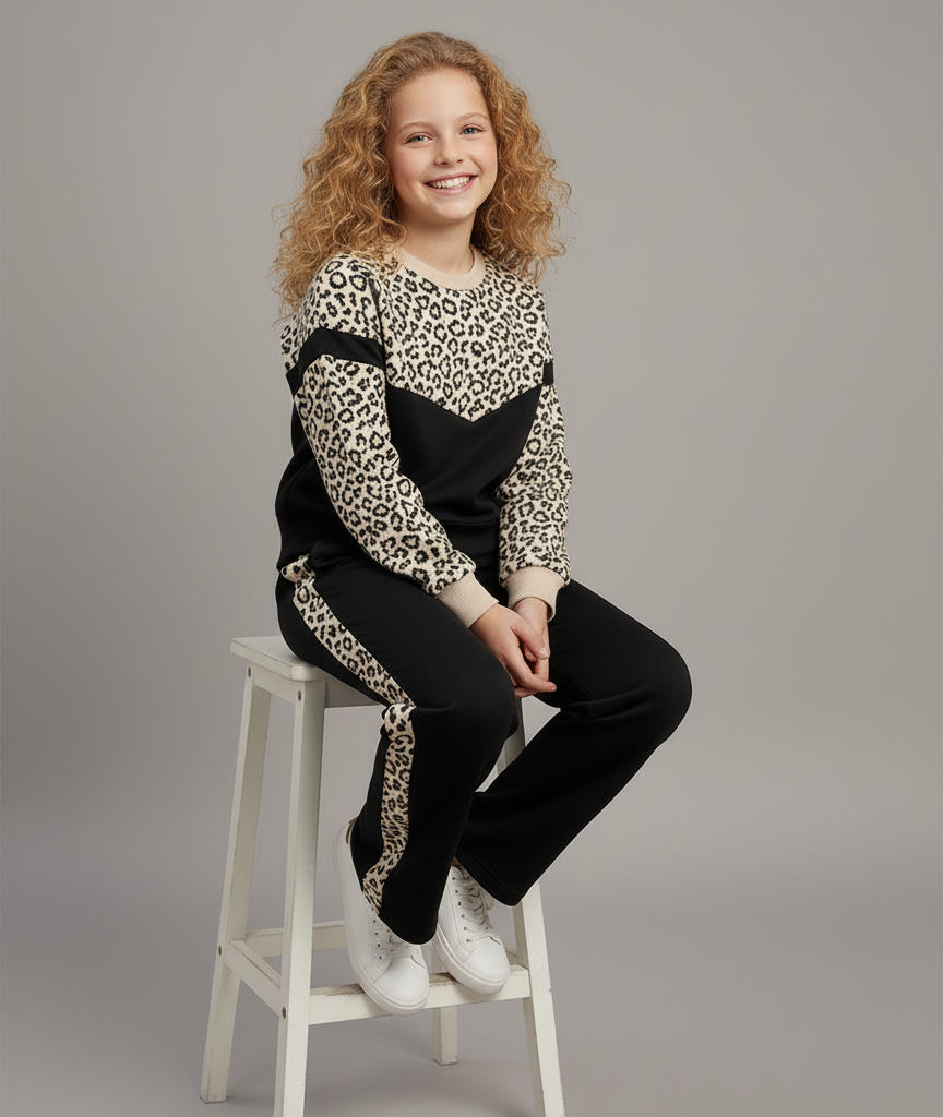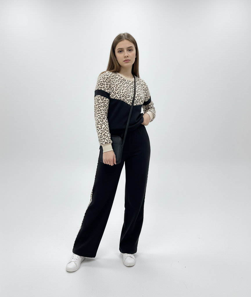 این ست بلوز و شلوار دخترانه ( شلوار بگ) با طرح حاشیه پلنگی انتخابی عالی برای استایل روزمره و اسپرت است.